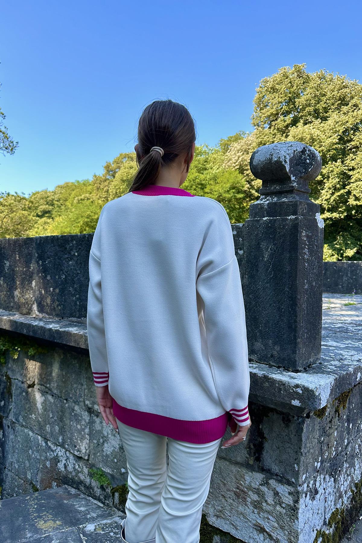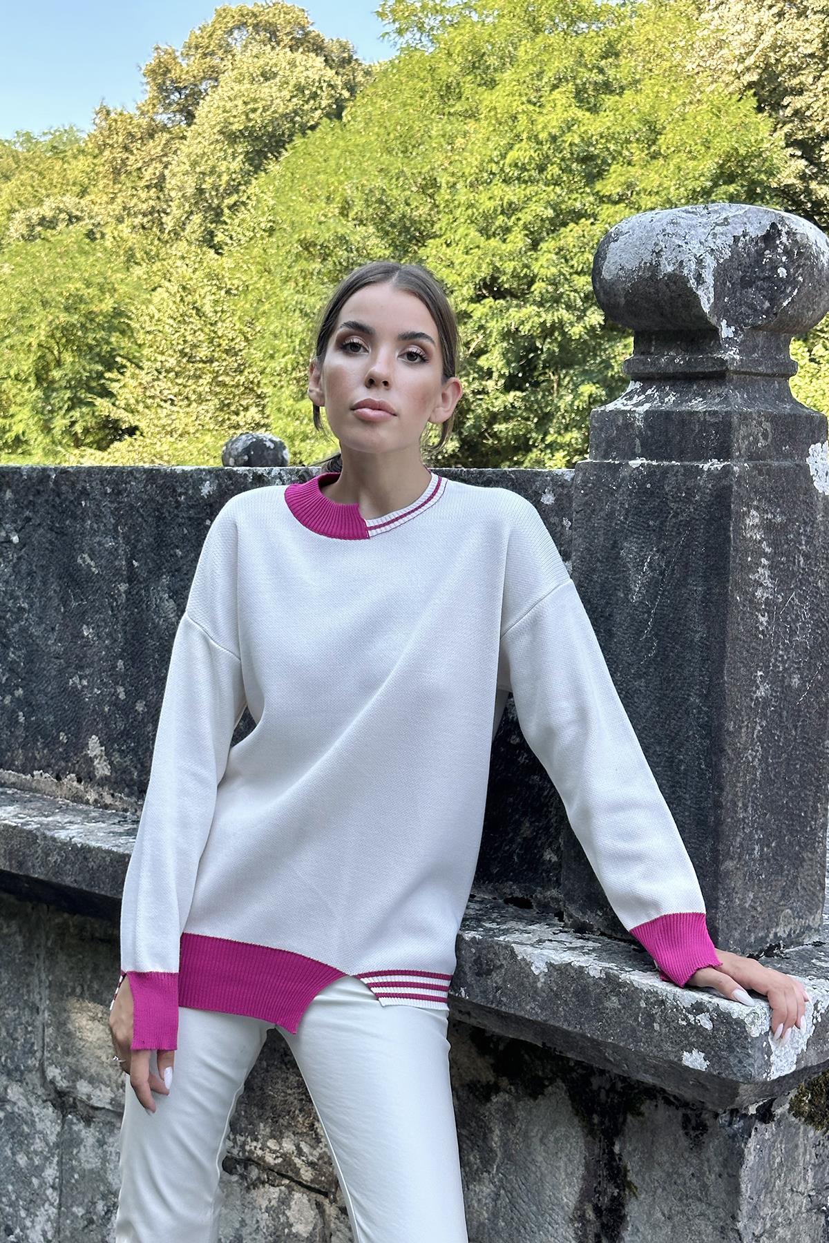 Toptan Fuşya Yaka Ve Manşet Garnili Triko Kazak