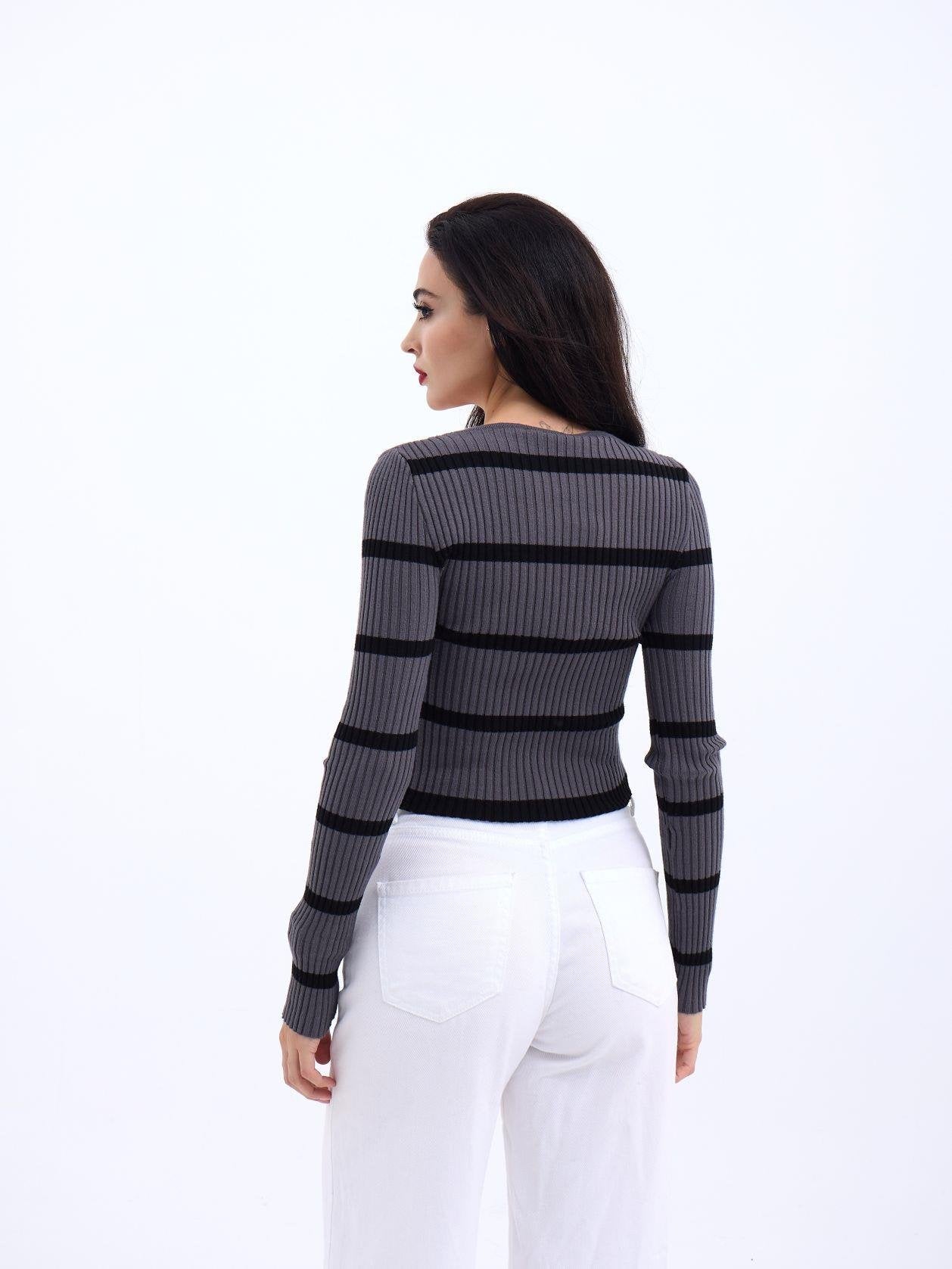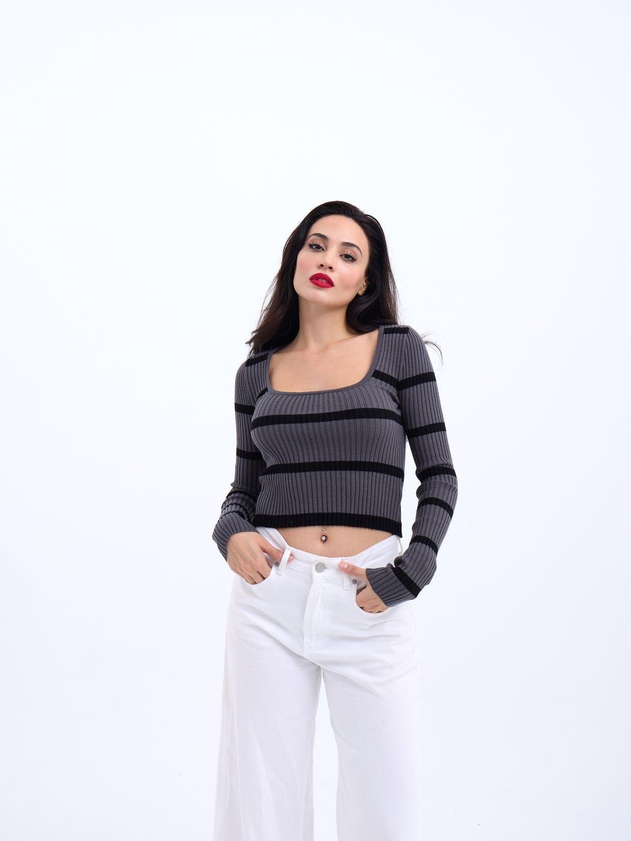 42221 TRİKO ÇİZGİLİ FİTİLLİ CROP-ANTRASİT-SİYAH