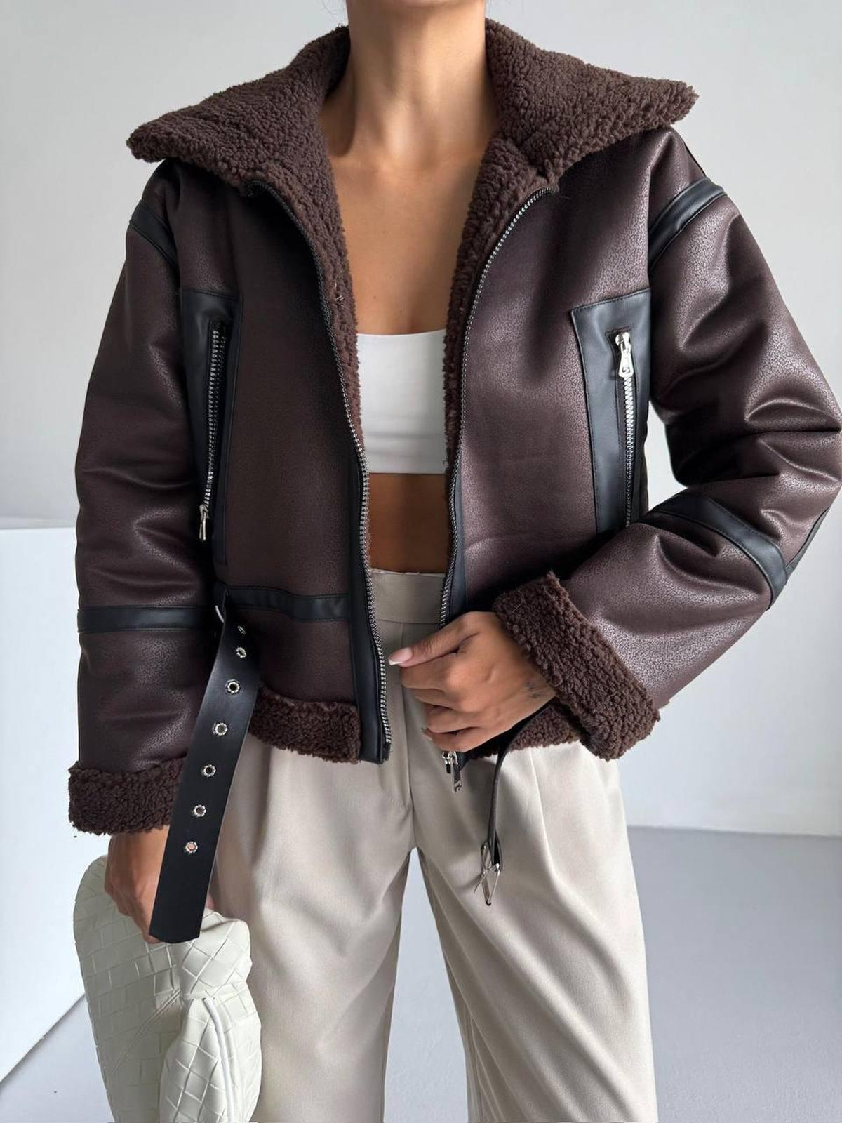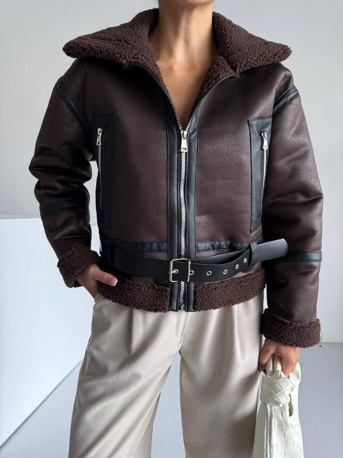 PELÜŞ DETAYLI DERİ CEPLİ MONT